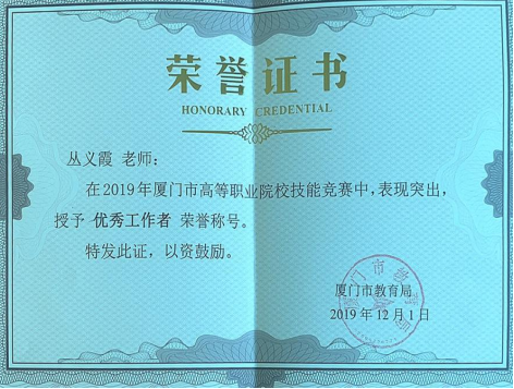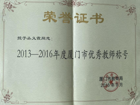 经过几年的努力,丛老师晋升成为副教授,先后参与学校“一轮评估”“二轮评估”“二轮评估回访”等迎评工作,并被评为评估先进个人。她在教学上具有较高影响力,先后被评为厦门市“双师型”教师、“优秀教师”,学校首届“最美教师”。她积极将教学成果转化为科研成果,公开发表学术论文5篇,出版专业教材3部,申请实用新型专利2个,参与国家级课题1项(第一参与人),获得省级教学成果奖1项,参与省级精品课程建设1门,其中《用心待人和做事,做“心”好老师》的论文获中共厦门市委教育工委学习习近平总书记重要讲话优秀征文评选的三等奖。