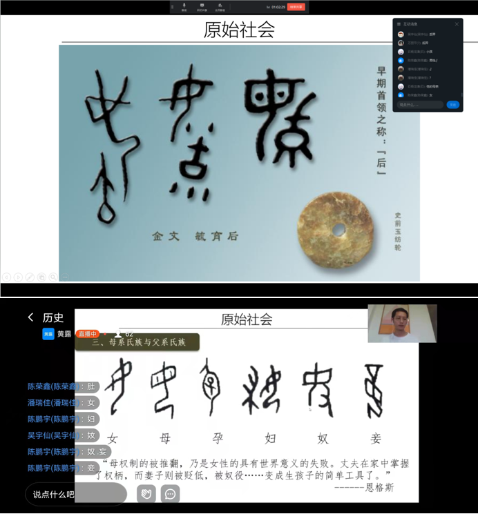 《历史》是五年专学生的一门公共基础课,重在培养和提高学生历史文化知识,提高学生的文化底蕴。黄露老师根据2020级与2021级学生的不同情况,采用钉钉与学习通相结合的方式进行线上教学。课程初期涉及的知识点以氏族社会、早期婚姻制度等较为晦涩的概念为主,为帮助学生理解,特地选取与之相关的甲骨文、金文为线索进行教学,既加深学生对中国传统文化的了解,又激发学生的思考,课堂讨论氛围浓郁。利用学习通等平台设置思考题、上传课程相关视频以方便学生的课前预习和课后回顾。
