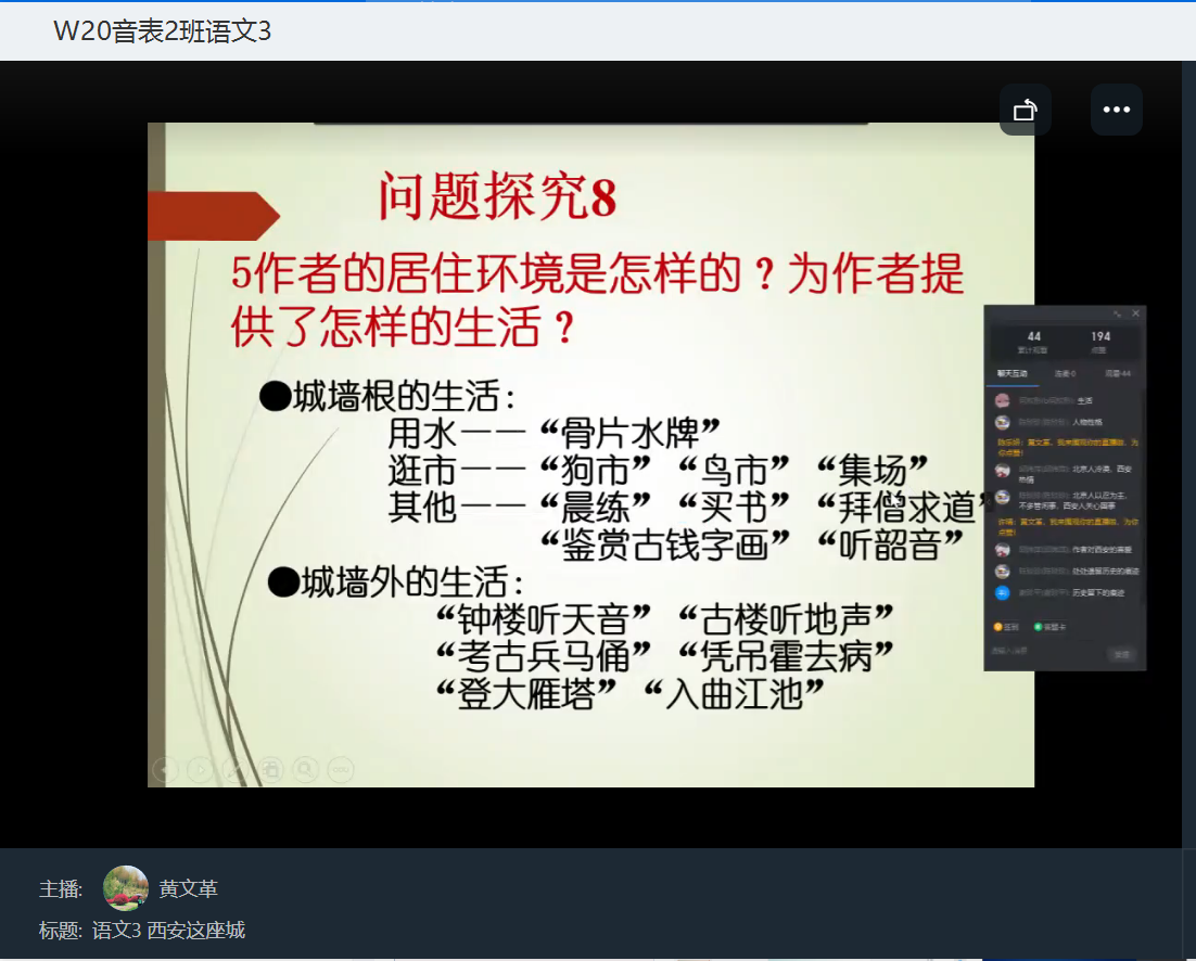 黄文革老师的语文课堂使用钉钉直播,凸显现场感、直观感、互动感、即时感等“四感”。直播中:10分钟签到、80分钟互动、10分钟运动。其中,10分钟签到。督促与融洽气氛结合,时尚音乐背景,师生互相问候,舍友相提携。提前10分钟创建直播课,给教师机会播放音乐、烘托气氛、召集学生,给学生时间签到、互相提醒、课前准备;80分钟互动。讲课与互动巩固结合,精炼语言表达,加重互动思考,减慢课堂节奏:用5分钟复习互动,将上次课涉及的文学常识设计3-6个填空题,供学生抢答得奖励;用65分钟进行新课互动,将新课的学习任务,分解为文体鉴赏常识、创作背景、作者经历、字词积累、结构梳理、佳句研磨、手法品鉴等细节、环节,每个环节皆进行讲授,辅以图片、视频旁解,穿插问答讨论、问题检测,将各环节任务一一化解,个个突破;用10分钟检测作业,钉钉群发布课堂作业,学生随堂提交,教师随堂批改,随堂纠错。