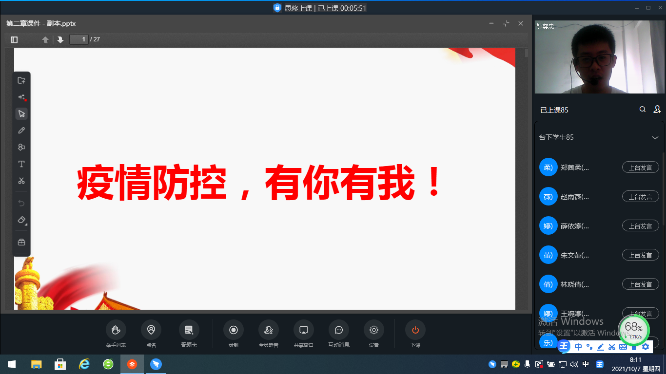 本学期,钟奕忠老师任教两门课程,一门是《思想道德与法治》,面向高职学生;一门是《思想政治1》,面向五年专学生。因此,他注重因材施教,针对学生的学习心理进行针对性开发教导。线上授课中,为了更好捕捉学生的注意度,在课程内容即PPT设置方面,钟老师突出“四史教育”对学生思想道德的引领作用,重点以新中国史以及中国共产党史为主进行重点介绍,尤其是自十八大十九大以来,习近平同志当选为国家主席所采取的一系列大政方针改革进行重点论述,突出建国以来为国家积极奉献的优秀科学家、教育家、共产党党员同志群体,引起学生共鸣。并穿插、结合当今最新时事政治内容进行引导式提问,吸引学生进行关注并解答学生疑问。最后,在课程即将结束时,回顾整体课程内容并布置作业,作业内容多以心得体会为主,以课文为主结合调查进行开放式回答,收获学生一致好评。