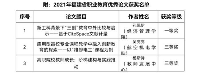 据悉,福建省职业教育优秀论文征集评选是由省职业技术教育中心组织开展的一项评选活动,每年评选一次,旨在促进我省职业教育理论研究、办学经验总结、教育教学改革创新,推动广大教师积极探索职业教育教学理论,切实提高职业院校教育教学质量。2021年共评选出442篇优秀论文,其中高职组一等奖23篇,二等奖36篇,三等奖58篇。