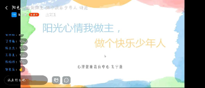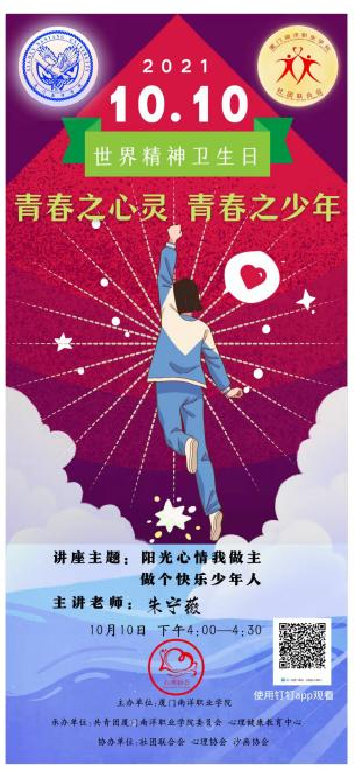 10月10日是世界精神卫生日,国家卫健委将本年度主题定为“青春之心灵,青春之少年”,为积极推动我校学生心理健康发展,当天下午,校团委和心理健康教育中心特邀心理咨询师朱宁薇为全校学生开展以“阳光心灵我做主,做个快乐少年人"为主题的心理健康讲座。受疫情影响,本次讲座使用钉钉直播的方式开展。本次讲座旨在让同学们以更优、更正确的心理精神状态融入大学校园生活,带领全校学生认识情绪。