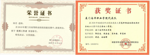 钟丹教授,现任艺术设计学院环艺教研室主任,福建省学校美育工作专家、福建省职业教育信息化教学专家、环艺专业带头人,厦门市“双师型”教师。业绩突出,成果颇丰,多次执教、执裁省市级职业技能竞赛,发表论文十余篇,参与课题五项。