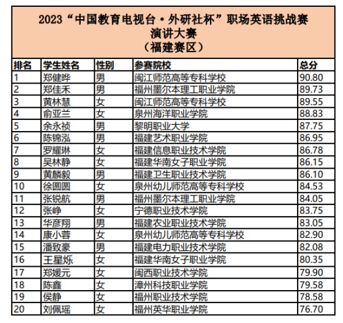 根据2023年“中国教育电视台•外研社杯”职场英语”挑战赛福建赛区决赛结果,现将演讲、写作选手成绩公示如下,公示期限为三个工作日。公示期结束后将发布两个赛项的获奖情况以及晋级国赛的院校和选手。